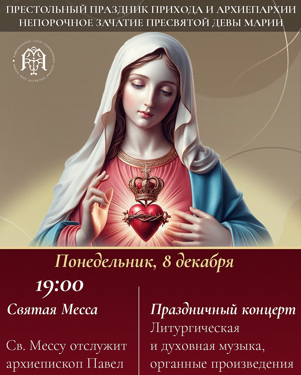 В 19:00 пройдет Св. Месса под предстоятельством архиепископа-митрополита Павла Пецци, затем — праздничный концерт. В нем участвуют Хор Кафедрального собора, органисты и приглашенные музыканты.