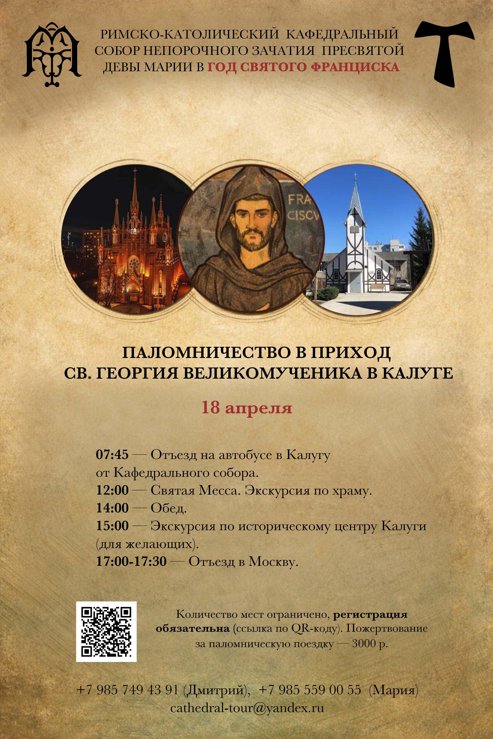 По случаю восьмисотой годовщины преставления Святого Франциска Ассизского, наш приход организовывает однодневное паломничество в гор. Калугу в ПРИХОД СВ. ГЕОРГИЯ ВЕЛИКОМУЧЕНИКА, паломничество состоится 18 апреля (суббота). Для участия в паломничестве требуется обязательная регистрация по ссылке. Все подробности и контакты организаторов размещены на афише.